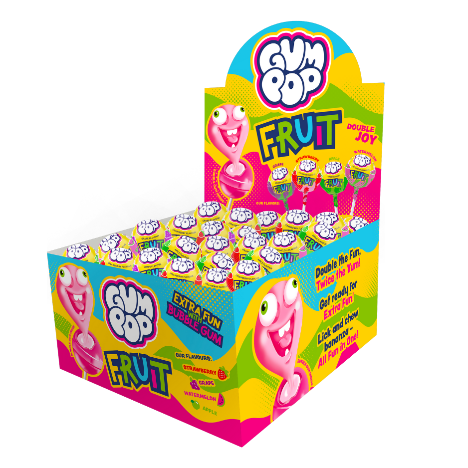 KONFEKTES KARAMELES UZ KOCIŅA AR KOŠĻ.GUMIJU GUM POP FRUIT 15G