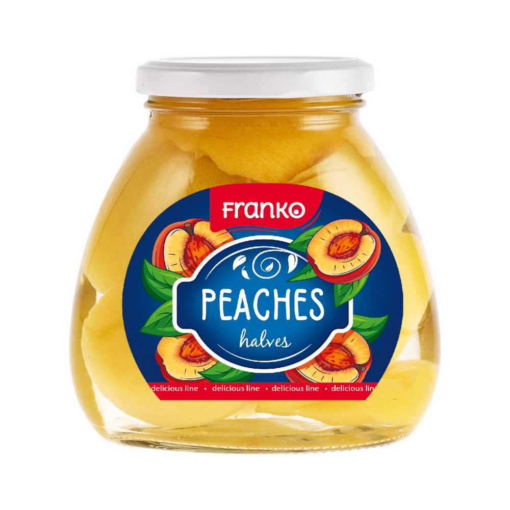 KOMPOTS PERSIKU PUSĪTES SĪRUPĀ FRANKO STIKLĀ 580G