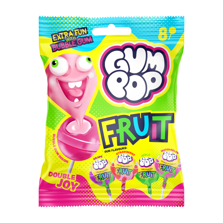 KONFEKTES KARAMELES UZ KOCIŅA AR KOŠĻ.GUMIJU GUM POP FRUIT 120G